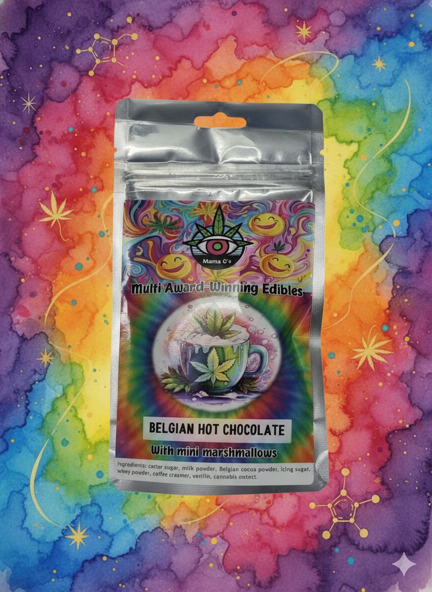 Nothing says “cozy winter vibes” like a mug of luxurious cannabis Mama G Belgian Hot Chocolate, with yummy bits of Belgian chocolate and mini marshmallows inside —steamy Belgian cocoa that wraps you in a velvet hug, melts away the chill with rich, velvety chocolate notes, and sneakily infuses a euphoric buzz that turns your couch into a throne. One sip, and you’re not just warm; you’re deliciously, gigglingly toasty from the inside out!