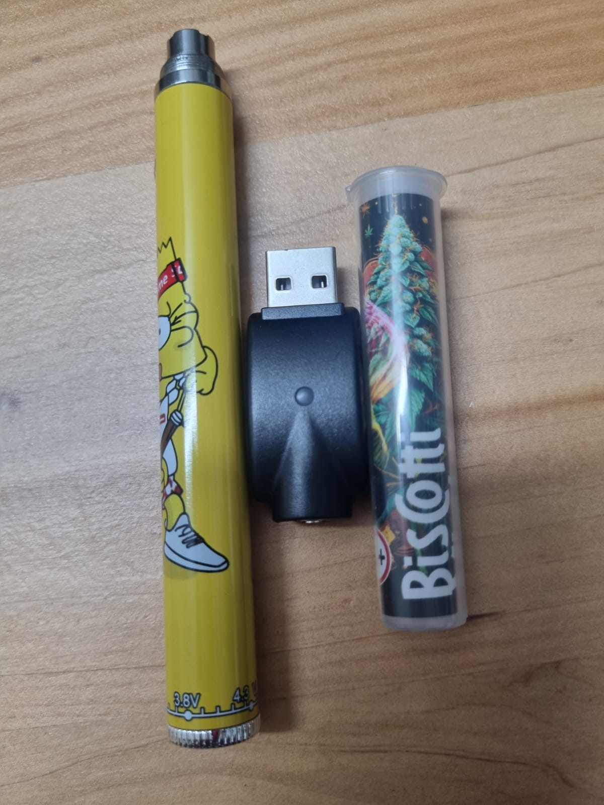 Dab vape kit, complete with battery, charger and dabpenz. Biscotti Mintz flavour.